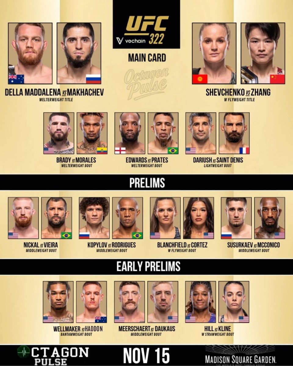以下为 UFC 322 完整对阵名单。